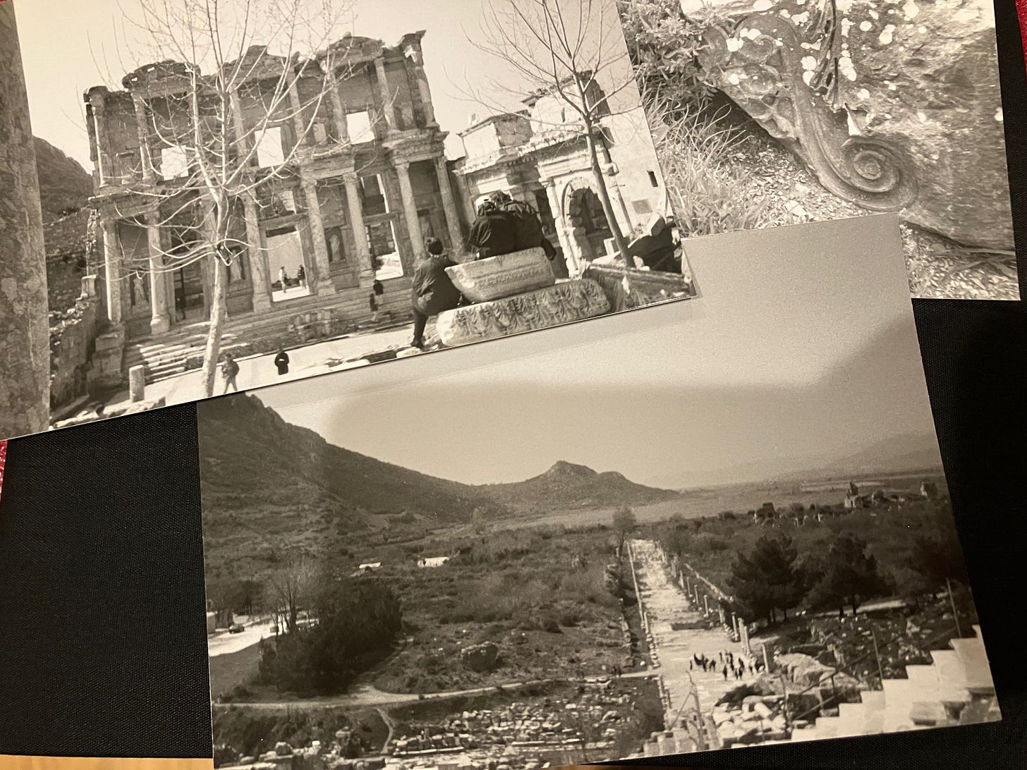 When I went to Turkey in 1997, I had a cheap little travel camera and only found out after the pictures were developed that I’d grabbed black and white film instead of color. Below is Ephesus: the Library of Celsus, a stone carving detail, and the harbor road from a vantage up in the ampitheater.