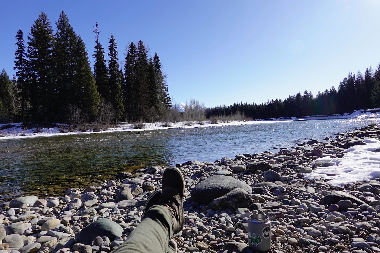 I’ve taken so many pictures of this particular curve of this particular river I couldn’t begin to count them. Pictures of sunrise from behind those mountains, of the rocks and ice where I sit to watch that sunlight grow hour by hour before finally flashing above the peaks, my scorching coffee pouring heat back into what a frozen early-morning river dip has snatched away.