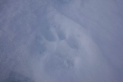 I had lingered by the river at sunset, as usual, and that night it snowed. The next day, toward sunset again, at that same spot, I almost walked right over fresh wolf tracks in the fresh snow. Struck still in amazement—we must have been there within hours of each other, if not minutes—I followed them down to the river, where the wolf had probably taken a drink of water not twenty feet from where I’d been sitting much of the chilly afternoon.