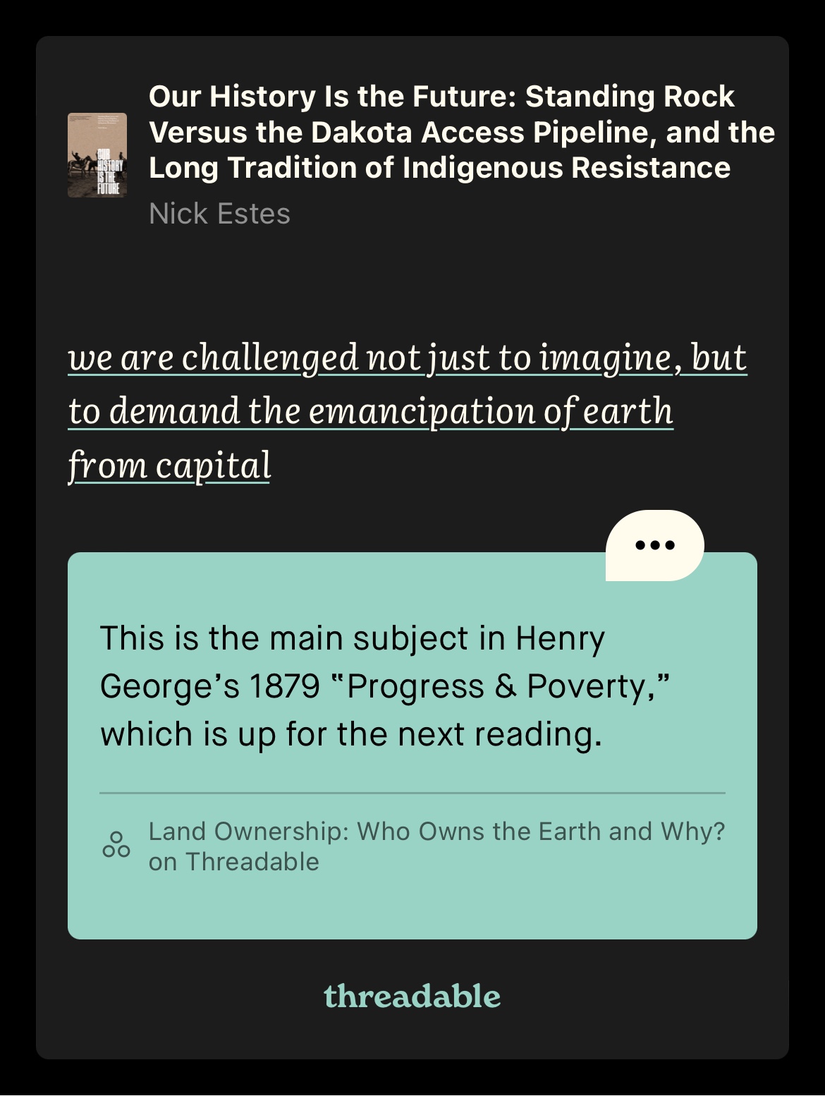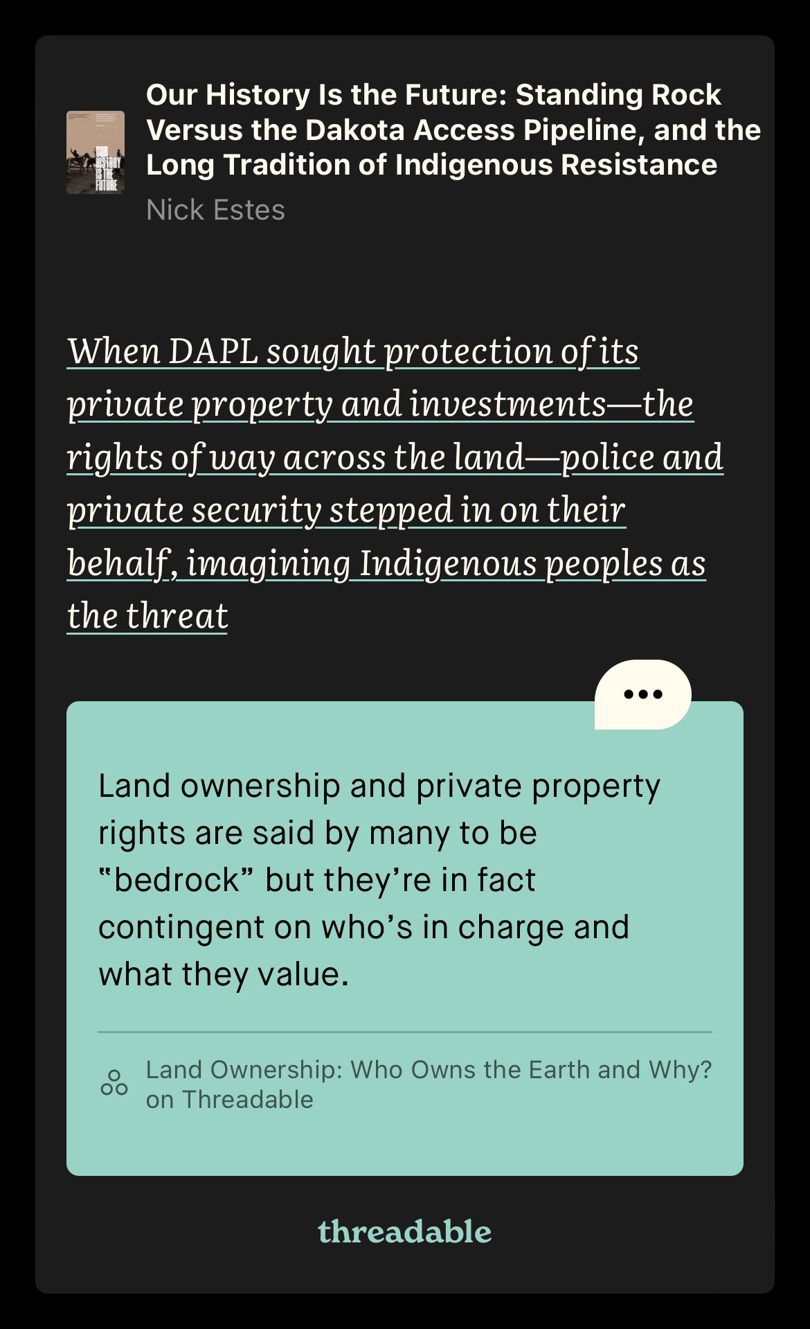 The most recent Threadable reading* for Land Ownership was a selection from Nick Estes’s book Our History Is the Future: Standing Rock Versus the Dakota Access Pipeline, and the Long Tradition of Indigenous Resistance, from the middle of Chapter 6: Internationalism, to the end of Chapter 7: Liberation, pages 242-257.