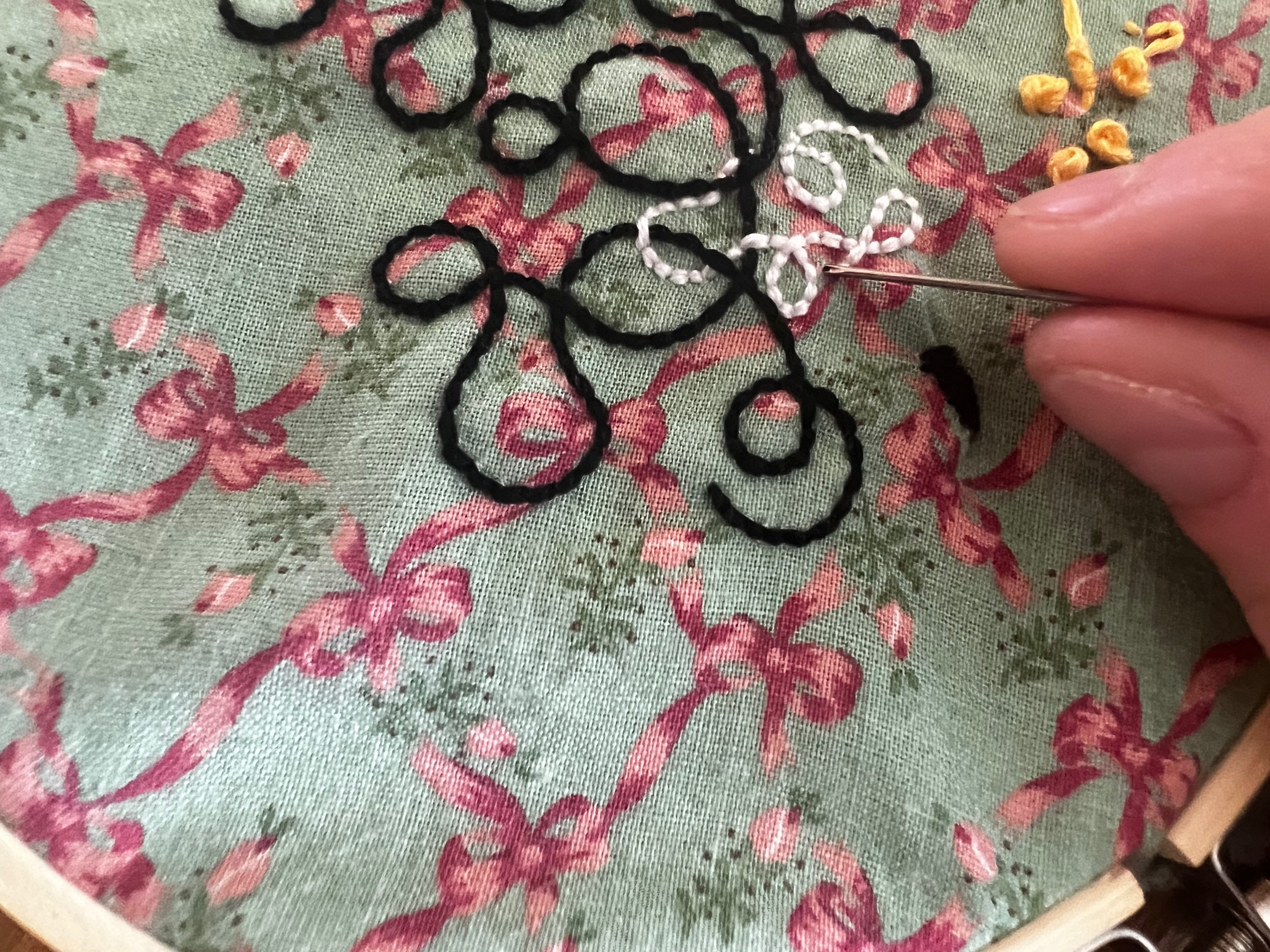 Creating things out of pleasure—things of beauty or delight, and of care, especially when made for someone else, has its own kind of lyricism, its own kind of submersion into something more than what most of us are told to care about. I like the backstitches and following whatever coiled, curled designs the needle has me do, unplanned meanderings across a piece of fabric that feel like they’re trying to say something. It’s how I write, really, and sometimes it feels like the world is too full of words for me to add any more. Sometimes it’s easier to write without them, to enliven stories through hands and fingers.