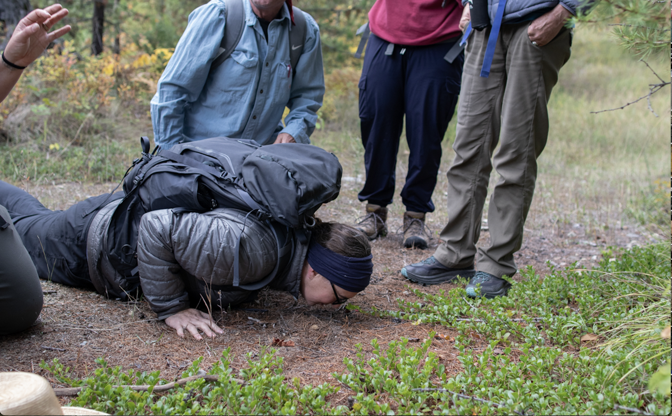 In fact, that goes for all learning. Even all creativity. That there is a picture of me smelling mountain lion pee. I kept going back for more because I couldn’t quite shape words around what it smelled like. The two sensory details that get overlooked in most writing are smell, and the feel of the air. “How would you describe it?” I kept asking the leader of our course as I went back down to smell again. “It’s almost skunky but not quite, almost a metallic undertone . . .”
